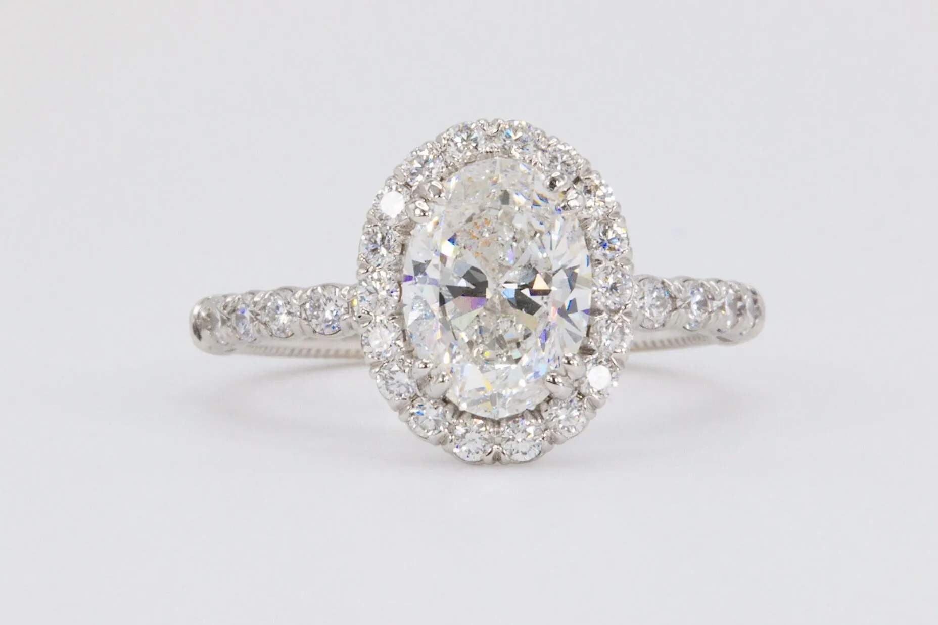 Diamond Exchange Houston has this beautiful 2.06 CTW Oval Cut Halo Engagement Ring available for only $6500. This ring features a natural 1.51 carat oval diamond as the main stone. This “Verragio” ring is made from 14k white gold and we can resize it to fit any finger.