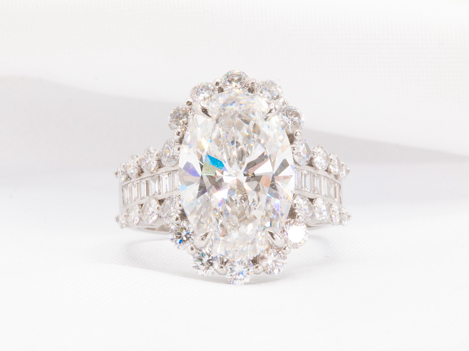 Diamond Exchange Houston has this beautiful 7.78 CTW lab Oval Halo Engagement Ring available for only $6200. This ring features a lab 6.03 carat oval diamond with “G” color and “VS2” clarity as the main stone. This custom built ring is made from 14k white gold and we can resize it to fit any finger.