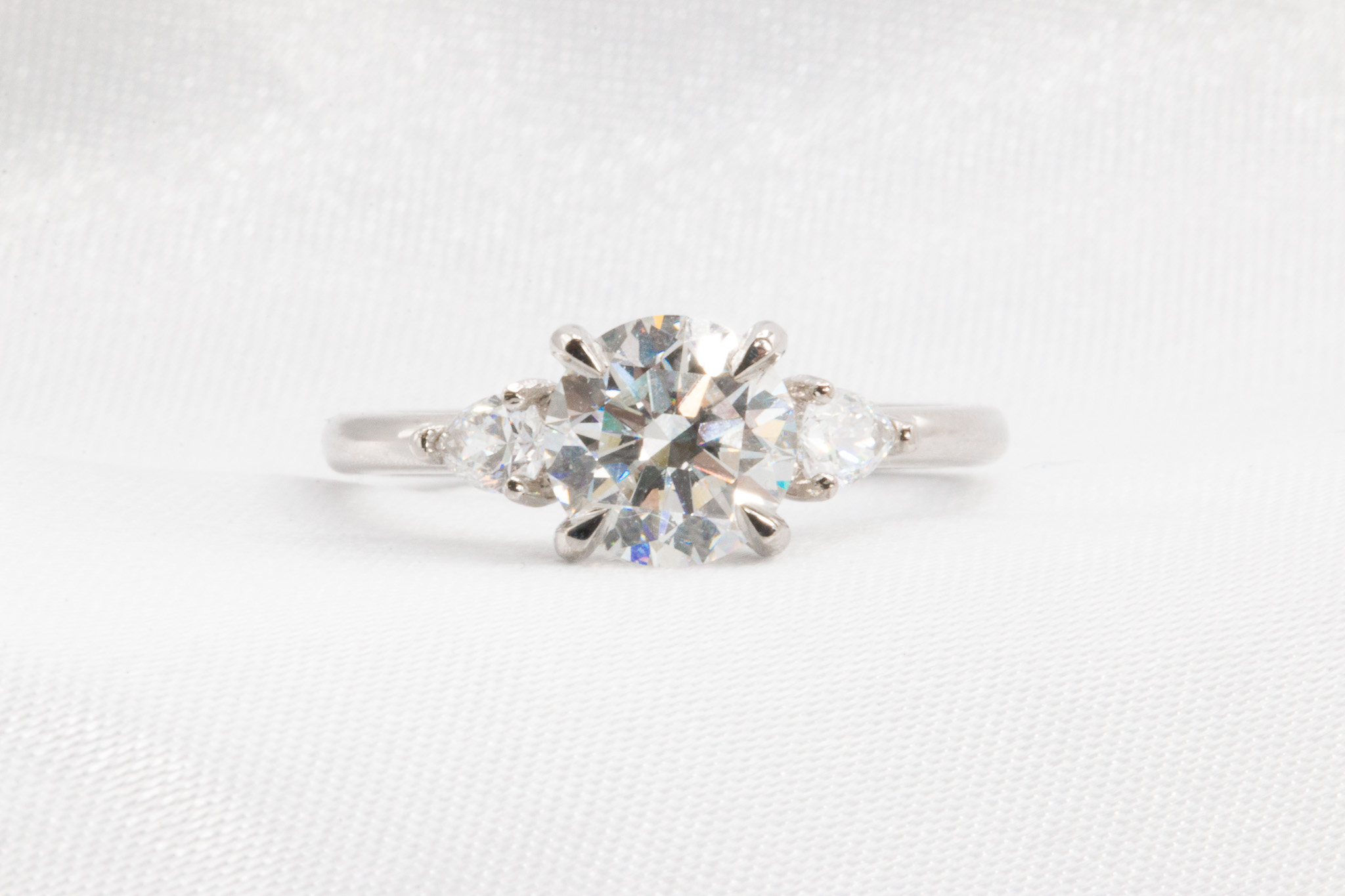 Diamond Exchange Houston has this gorgeous 1.81 CTW GIA Round Cut 3 Stone Engagement Ring available for only $2100. This ring features a 1.51 carat Certified “E” “VVS2” Lab round cut diamond as the main stone. Side stones are lab pear shape. The ring is made from 14k white gold and it can be resized to fit any finger. We only have 1 ring like this available so get it while it lasts. If you are interested in purchasing this engagement ring then please fill out our contact form to schedule an appointment or call us today at 281-623-1105. Diamond Exchange Houston has a large selection of engagement rings in-store and we are experts at creating custom engagement rings.