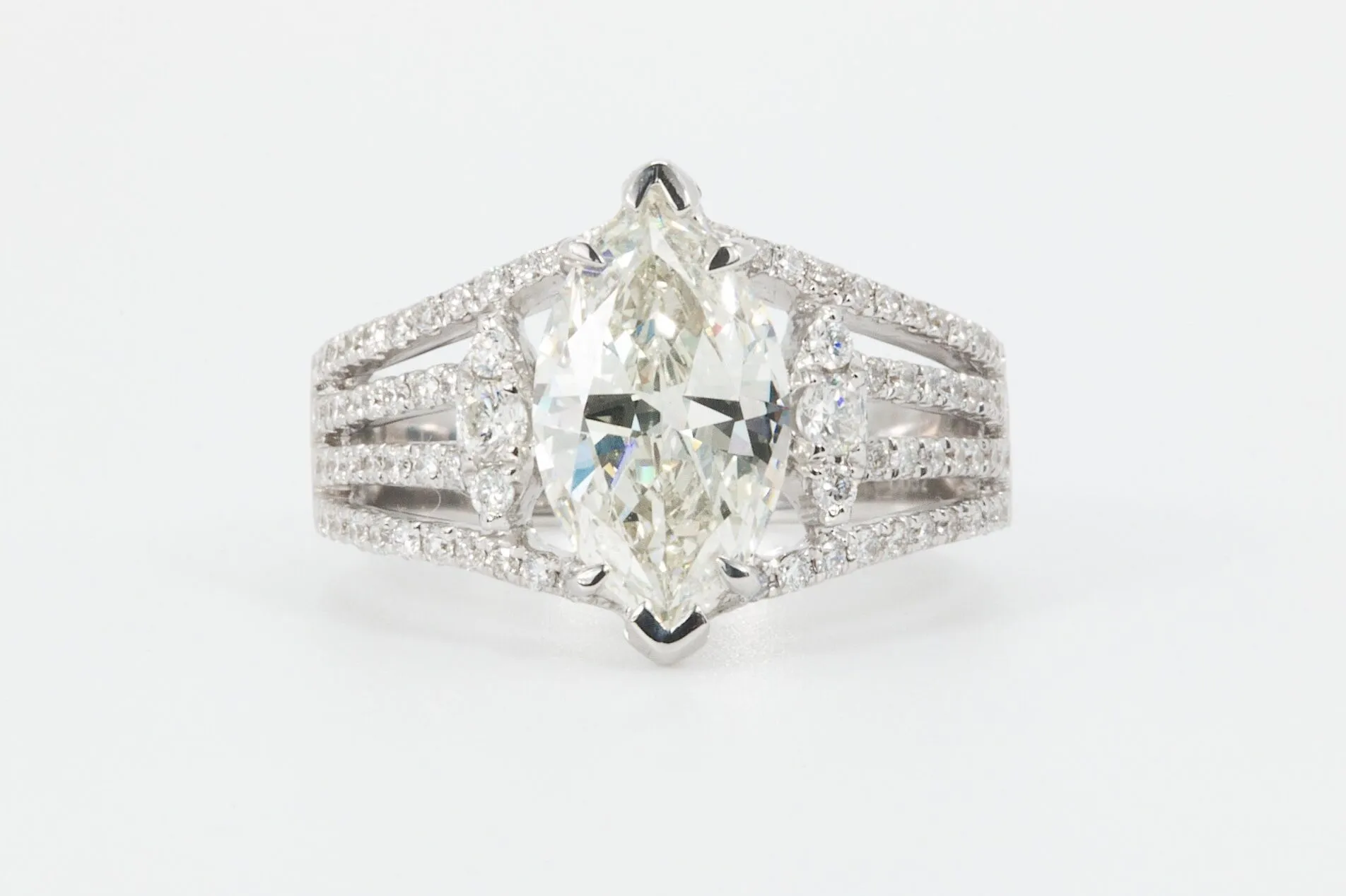 Diamond Exchange Houston has this beautiful 2.52 CTW Marquise Cut Engagement Ring available for only $9600. This ring features a natural 2 carat marquise diamond “L” color “SI2” clarity as the main stone with GIA certificate. This ring is made from 18k white gold and we can resize it to fit any finger.