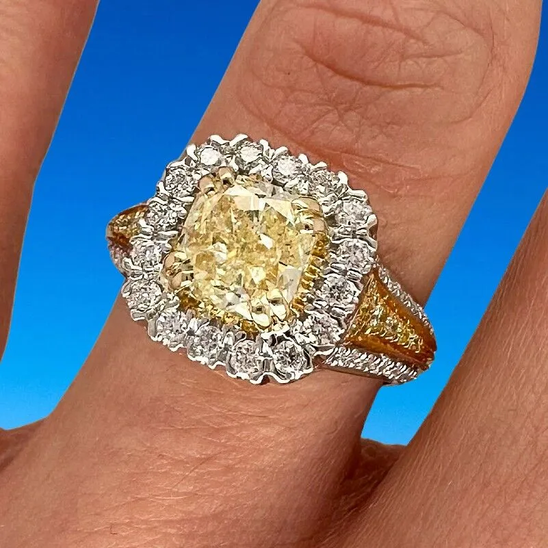 Diamond Exchange Houston has this 2.91 CTW 18K GIA Yellow Diamond Ring available for only $11,000 . This ring features a 1.93 carat GIA certified natural yellow cushion cut diamond as the main stone. The ring is 2-tone and make from 18k gold. Ring sizing is available. We only have 1 ring like this available at this price so get it while it lasts.