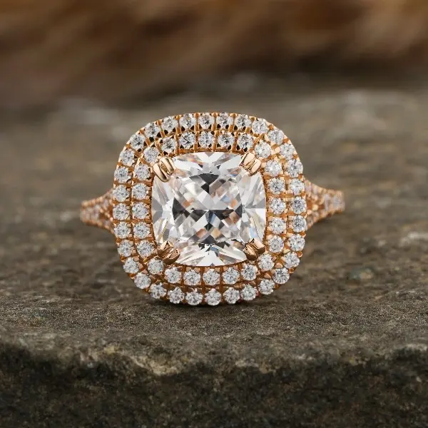 Diamond Exchange Houston has this 3 CTW Custom Lab Double Halo Engagement Ring made to order for only $4500. This ring features a certified 2 carat cushion cut lab grown diamond. The double halo split shank setting is made from 14k rose gold and can be made for any ring size. Also, this ring can be created in white and yellow gold.