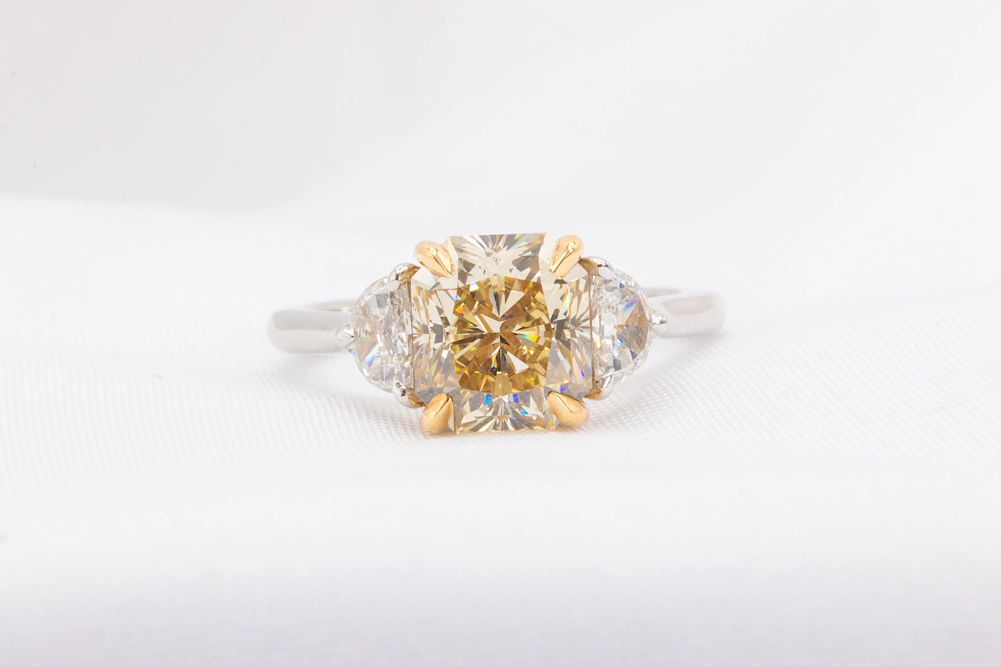 Diamond Exchange Houston has this gorgeous 4.01 CTW GIA Radiant Cut Engagement Ring available for only $27,000. This ring features a 3.51 carat GIA Certified NATURAL fancy color radiant cut diamond as the main stone. Side diamonds are 0.40 ctw. The ring is made from platinum and yellow gold and it can be resized to fit any finger. We only have 1 ring like this available so get it while it lasts. If you are interested in purchasing this engagement ring then please fill out our contact form to schedule an appointment or call us today at 281-623-1105. Diamond Exchange Houston has a large selection of engagement rings in-store and we are experts at creating custom engagement rings.