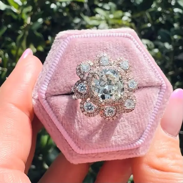 Diamond Exchange Houston has this 4.17 CTW Antique Diamond Flower Ring available for only $12,800. This ring features a 2.77 carat natural round diamond as the main stone. The setting is made from 18k white gold, includes natural pink diamonds, and it can be resized to fit any finger. We only have 1 ring like this available at this price so get it while it lasts.