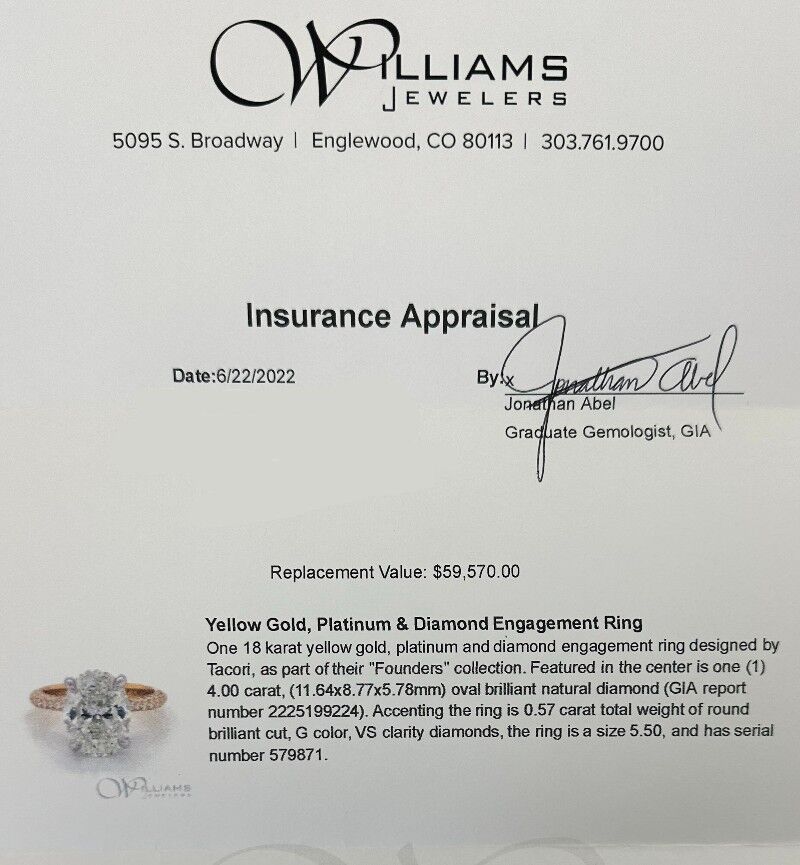 Diamond Exchange Houston has this 4.57 CTW Tacori Hidden Halo Engagement Ring available for only $47,500. This ring appraised by a 3rd party for over $59k! This ring features a natural 4.00 carat GIA Certified oval diamond. The hidden halo setting was created by ring designer Tacori and is made from 18k yellow gold and platinum. We can resize this ring to fit any finger. We only have 1 ring like this available so get it while it lasts.