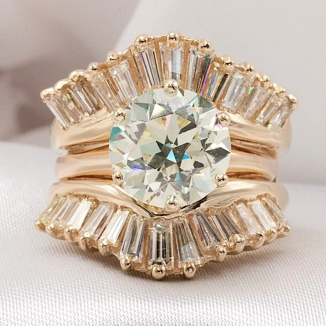 Diamond Exchange Houston has this stunning 5.08 CTW Solitaire Engagement Ring and Ring Guard/Wedding Band available for only $19,000. This ring features a natural Old Euro cut 3.58 carat round diamond set in a 14k solitaire setting. The custom ring guard features 1.50 carats of baguette cut diamonds and it fits with the solitaire ring perfectly. All diamonds in this ring are very FINE NATURAL DIAMONDS!! We only have 1 set like this available so get it while it lasts.