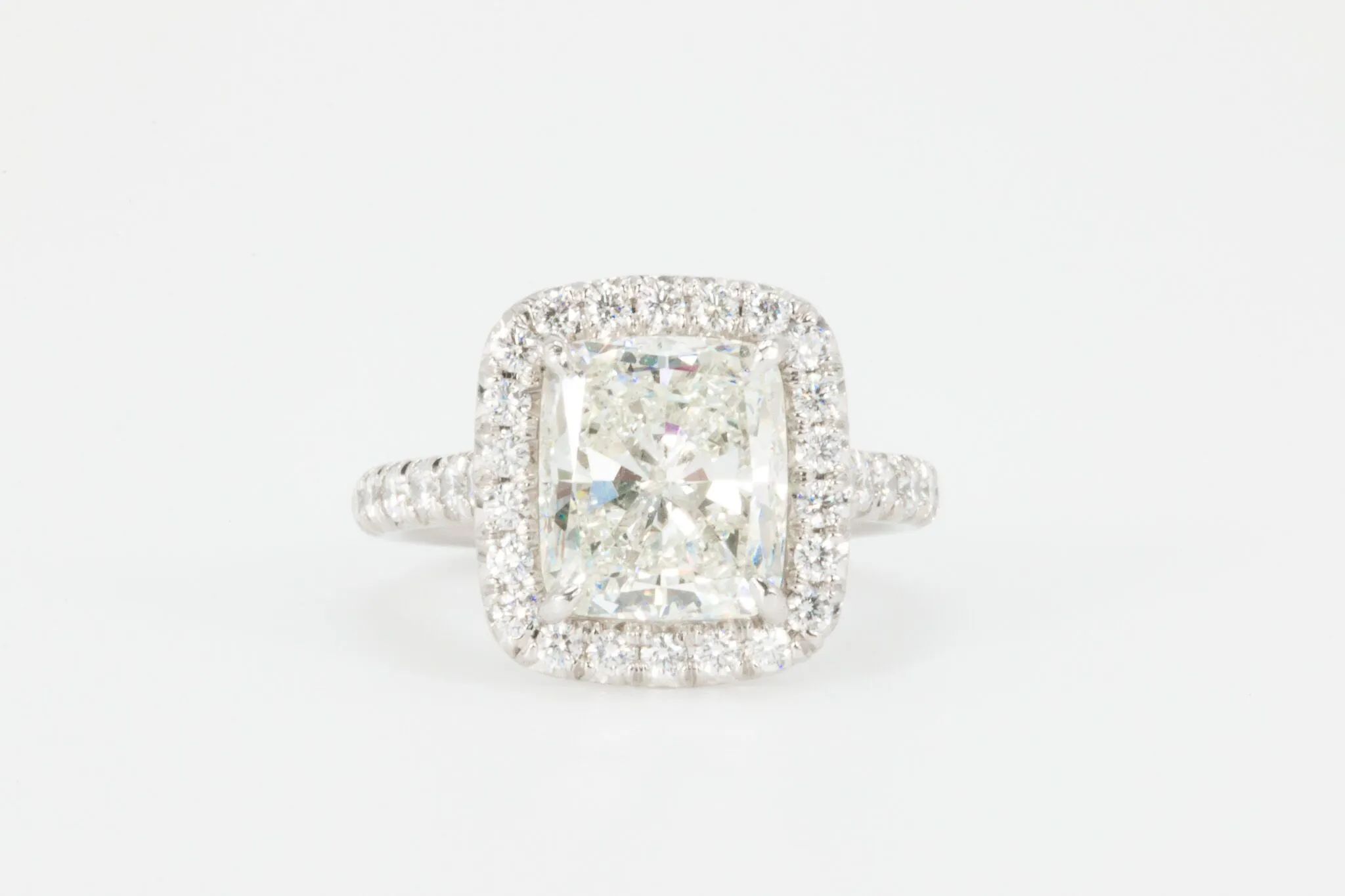Diamond Exchange Houston has this beautiful 3.71 CTW Cushion Cut Engagement Ring available for only $24700. This ring features a natural 3.02 carat cushion diamond “J” color “SI1” clarity as the main stone with GIA certificate. This ring is made from 18k white gold and we can resize it to fit any finger.