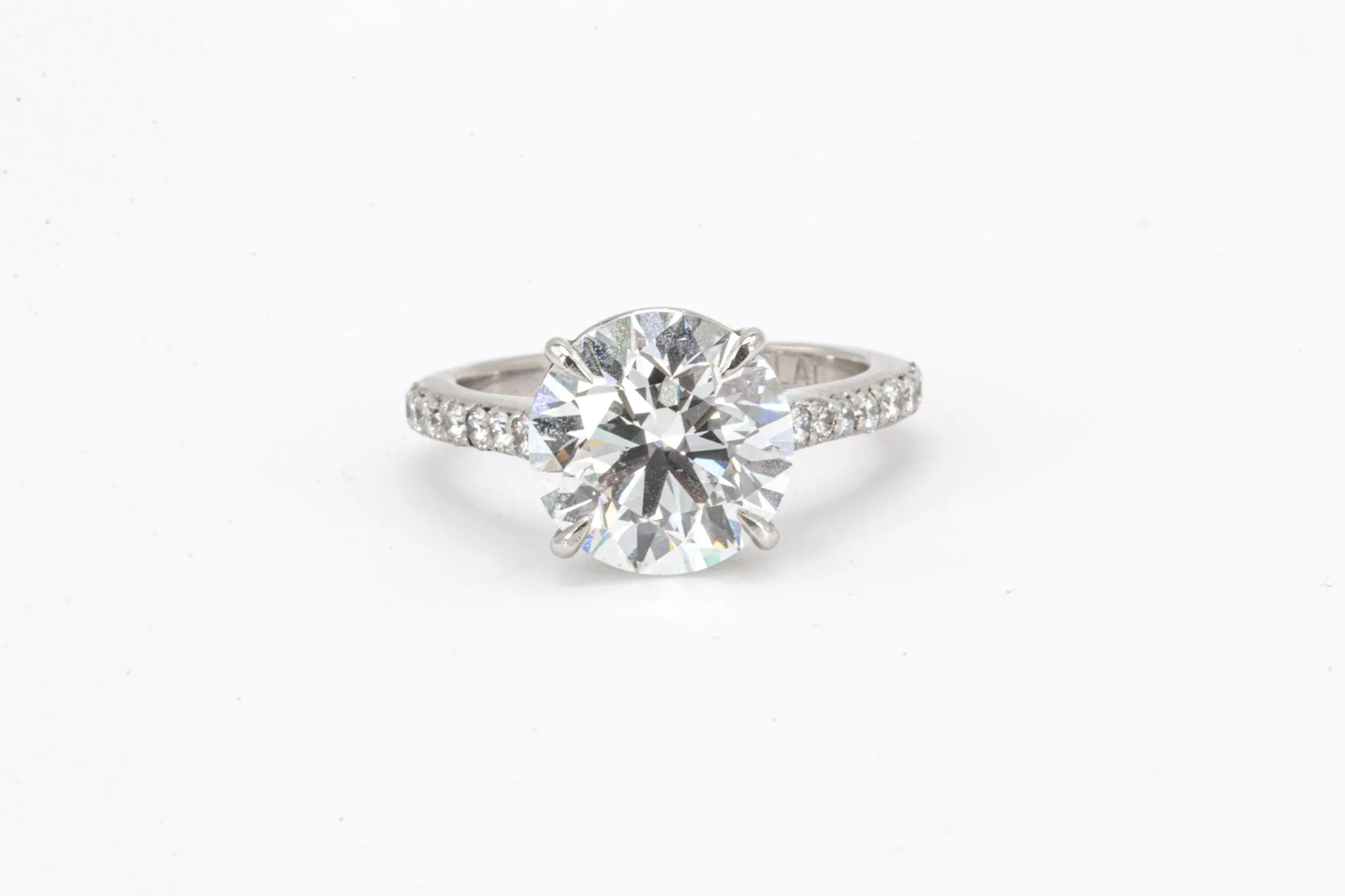 Diamond Exchange Houston has this beautiful 4.35 CTW Round Cut Lab Engagement Ring available for only $4900. This ring features a lab 4 carat round diamond “E” color “VS1” clarity as the main stone with IGI certificate. This ring is made from Platinum and we can resize it to fit any finger.