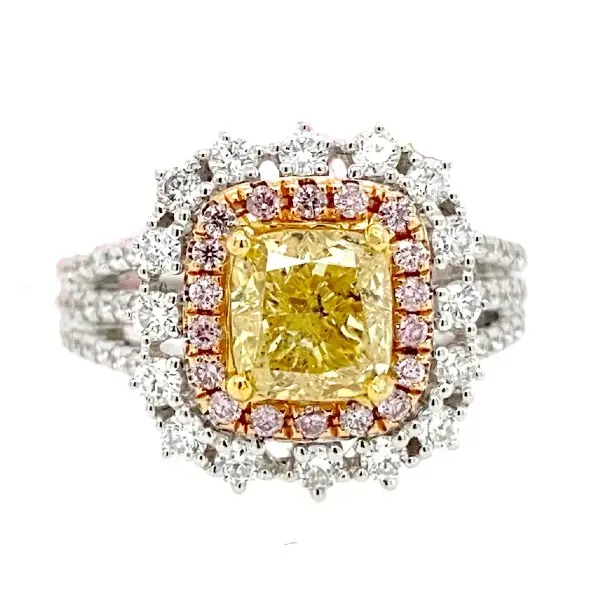 Diamond Exchange Houston has this breathtaking 2.71 CTW GIA Fancy Yellow Engagement Ring available for only $10,000. This ring features a GIA Certified 1.69 carat fancy yellow cushion cut as the main stone. The double halo 2-tone setting is made from 18k white and rose gold, contains white and pink round brilliant diamonds, and it can be resized to fit any finger. We only have 1 ring like this available so get it while it lasts.